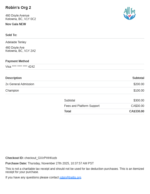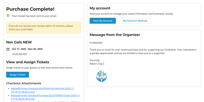 After a donor completes their ticket purchase, they’ll see a confirmation webpage and receive an automated email with attachments.