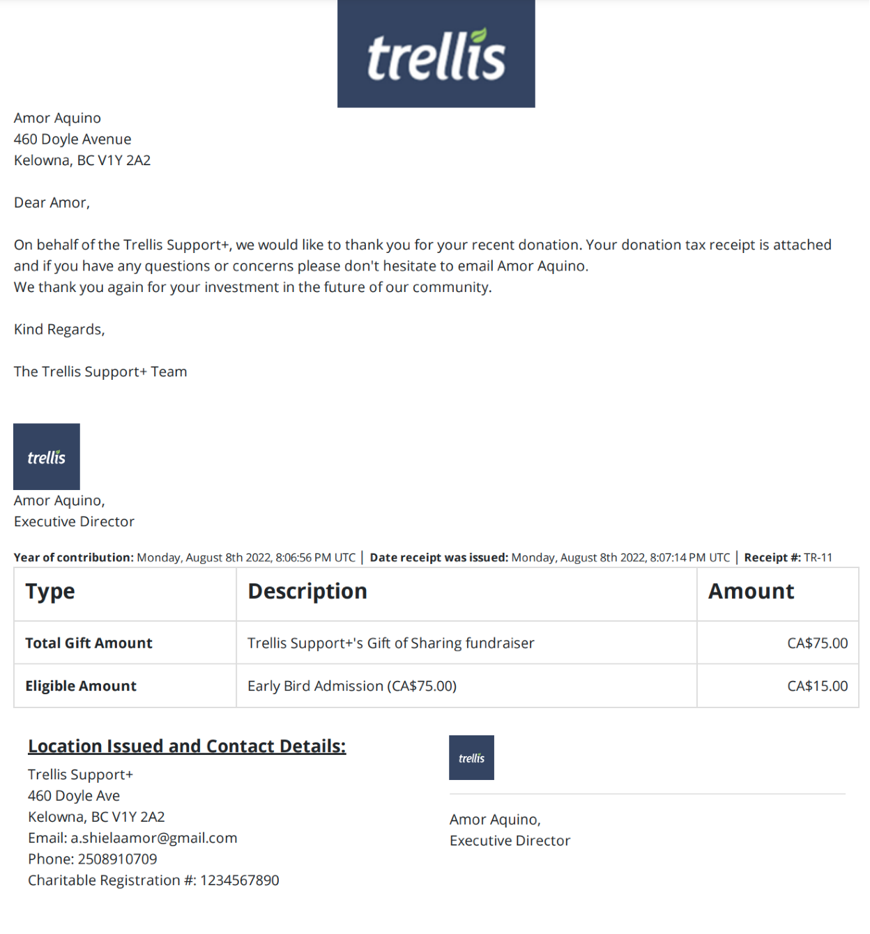 If tax receipting is enabled, donors will receive a CRA-compliant receipt for eligible amounts. This receipt is automatically generated using your tax receipt template.