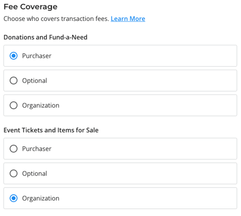 - If you'd like to absorb the fees yourself, select Organization.