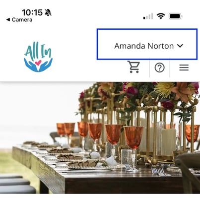 - From the fundraiser page, select your name in the top right corner to open the menu.