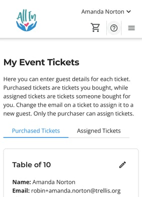 If you have purchased tickets for an event, those tickets will appear in your account for easy reassignment. Once a ticket is assigned, the guest receives a notification and copy of their ticket.