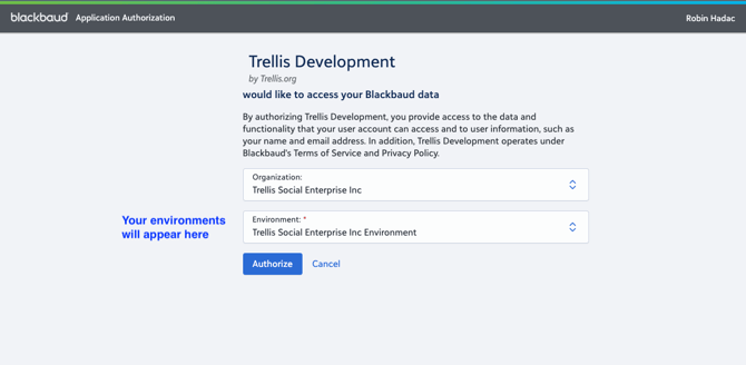 Clicking Connect will prompt you to authorize your account through Blackbaud. Follow the steps as indicated, and ensure you select the right environment in Blackbaud.