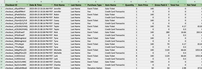 - Event Ticket Sheet (if applicable): This shows every event ticket that was purchased, who it was purchased by, and who it's assigned to.