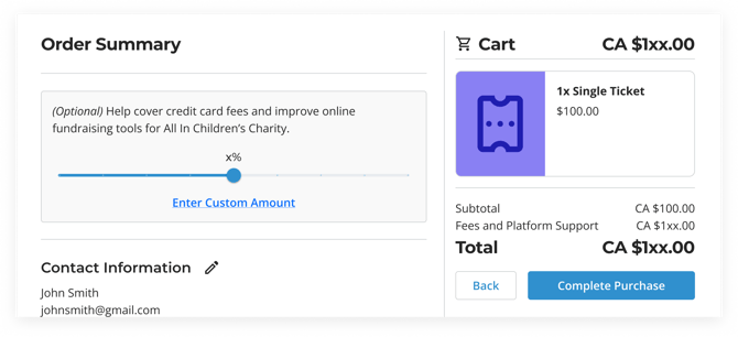0% Fees will not be eligible for checkouts made via the Sales Entry System (SES) or Attendee Cart in the Check-In Tool. To make the most of this feature, you should encourage donors to complete purchases themselves from their own account.
