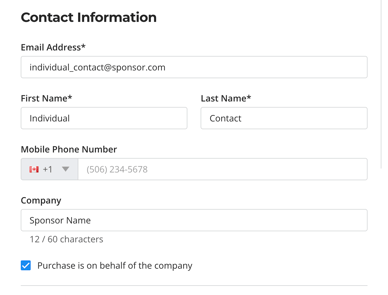 - Enter the sponsor's contact information. Note - our system requires an individual representative from the sponsor to make a purchase. A company alone cannot make a purchase.