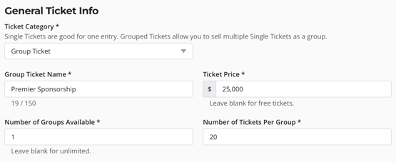 - Under Ticket Type, choose Grouped Ticket. This allows you to sell a single ticket for a group of attendees, such as a table of 10.