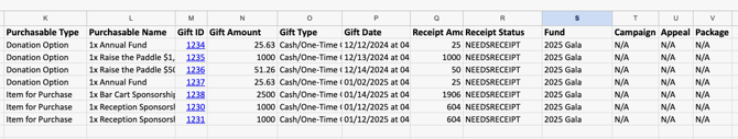 - Receipt Status: Whether the gift was receipted on Trellis or needs a receipt.