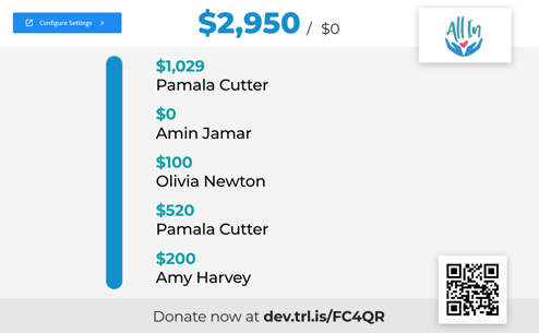 - Can be used by AV teams to build their own view using screen capturing. It includes the donor roll, thermometer, and total raised.