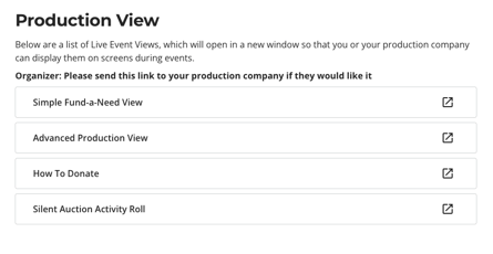 Live Event Views are used to showcase fundraising progress, donor recognition, and auction activity on screens during your event.