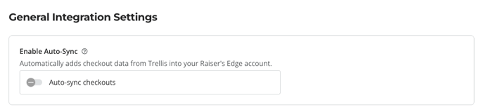 - In this section, you can enable the Auto-sync checkouts feature. To activate the integration and sync transactions, you must turn on auto-sync. Once enabled, every transaction made on Trellis will automatically appear in your Raiser’s Edge account.