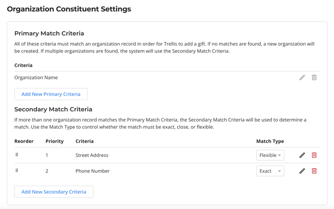 Primary Match Criteria are used first to find an existing organization constituent in your database.