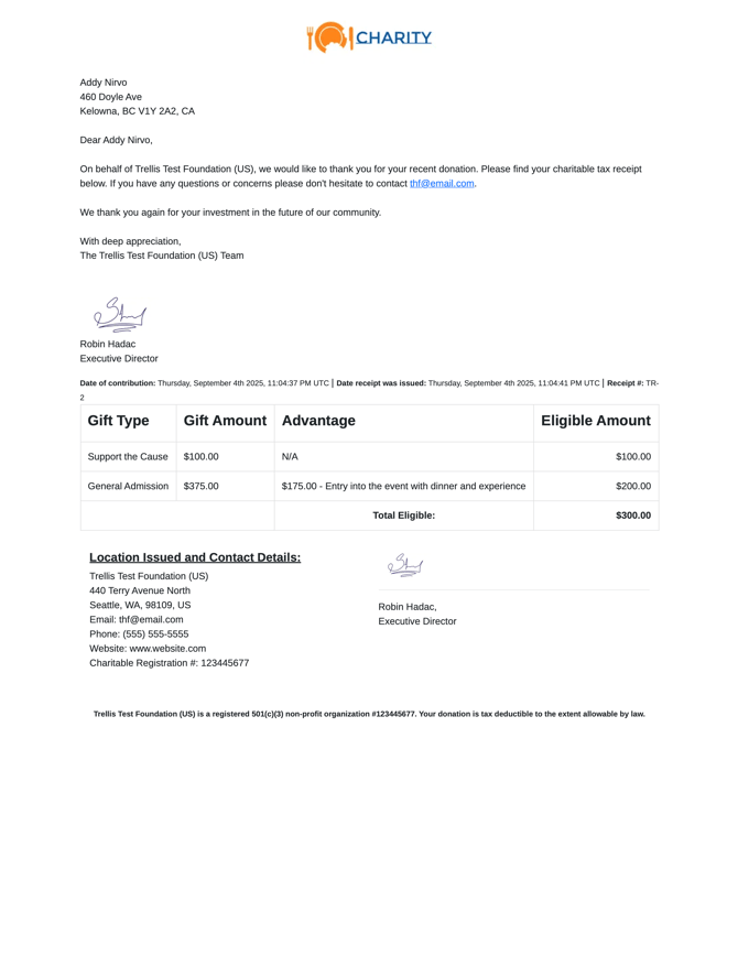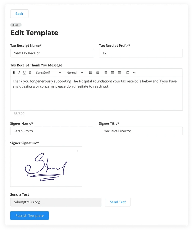 - Test the Template: Send a test tax receipt to your account email to verify its appearance and content.