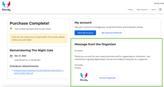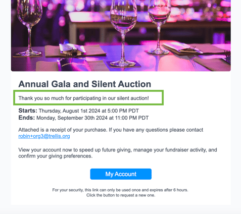 If checkouts contain auction items or donations with other things purchased (like items for sale and event tickets), the default thank you message is used. This includes auction item purchases with a Donate Your Bid donation.