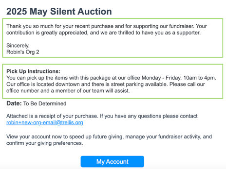 Below is an example of a confirmation email with both a thank you message, and the pickup instructions included on a silent auction item: