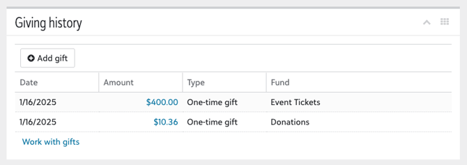 For example, if a donor buys four event tickets at $100 each, and the donor covers the $10.36 in fees, those fees will now sync as a separate gift into Raiser's Edge, instead of being connected to the event ticket, donation, and item gifts.