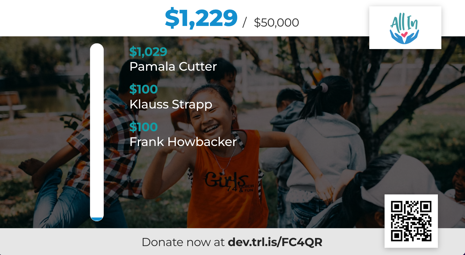 The FAN Live Event View should be used when donors are participating from their mobile devices. The view shows a QR code to the FAN flow, as well as an activity roll displaying donations as they come in.