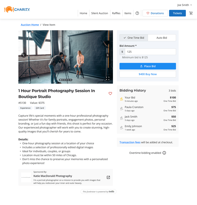 Buy Now: If a Buy Now price is set, the donor has the option to buy the item outright instead of bidding.