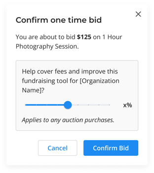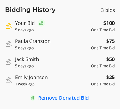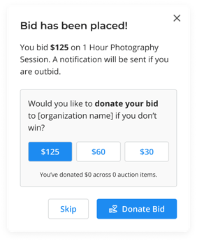 - Once their bid has been placed, if Donate Auction Bid is enabled, donors will be asked if they would like to donate some or all of their bid if they don't win.